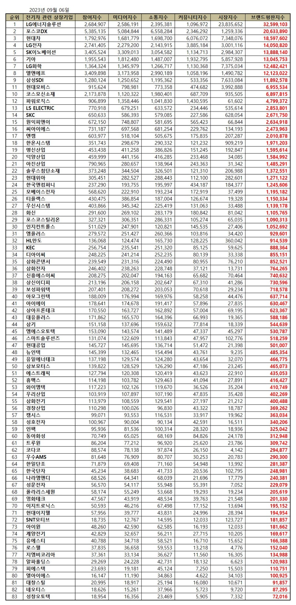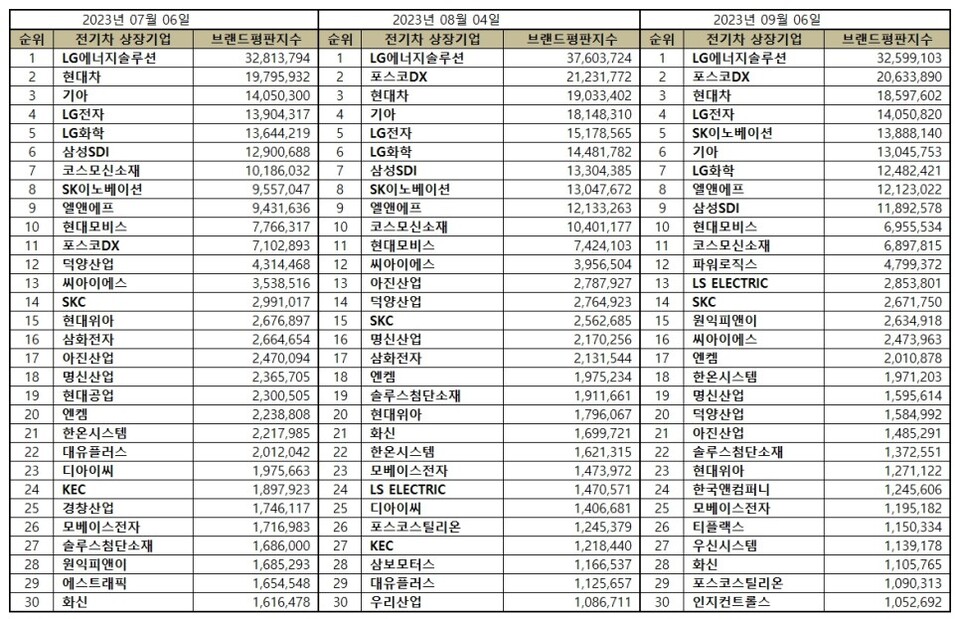 전기차 관련 상장기업 브랜드평판 2023년 9월 빅데이터 분석 30위 순위는 LG에너지솔루션, 포스코DX, 현대차, LG전자, SK이노베이션, 기아, LG화학, 엘앤에프, 삼성SDI, 현대모비스, 코스모신소재, 파워로직스, LS ELECTRIC, SKC, 원익피앤이, 씨아이에스, 엔켐, 한온시스템, 명신산업, 덕양산업, 아진산업, 솔루스첨단소재, 현대위아, 한국앤컴퍼니, 모베이스전자, 티플랙스, 우신시스템, 화신, 포스코스틸리온, 인지컨트롤스 순이었다.