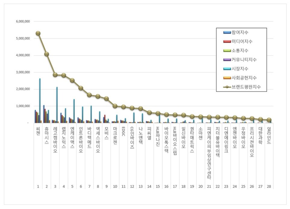3위, 레고켐바이오 브랜드는 참여지수 185,196 미디어지수 165,719 소통지수 162,947 커뮤니티지수 114,415 시장지수 2,128,163 사회공헌지수 93,709가 되면서 브랜드평판지수 2,850,149로 분석됐다. 지난 8월 브랜드평판지수 2,948,933과 비교해보면 3.35% 하락했다.