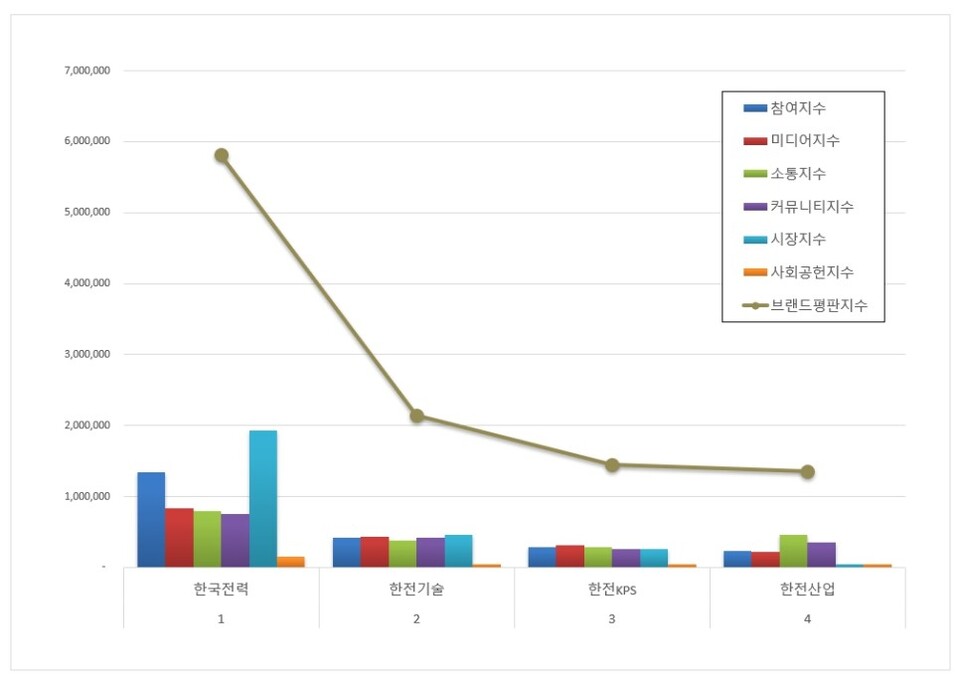 1위, 한국전력 브랜드는 참여지수 1,338,444 미디어지수 838,970 소통지수 797,361 커뮤니티지수 752,287 시장지수 1,931,080 사회공헌지수 149,513이 되면서 브랜드평판지수 5,807,654로 분석됐다. 지난 8월 브랜드평판지수 7,446,497과 비교해보면 22.01% 하락했다.
