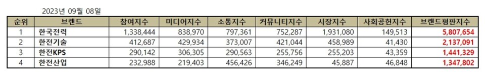 4위, 한전산업 브랜드는 참여지수 232,988 미디어지수 219,403 소통지수 456,426 커뮤니티지수 346,249 시장지수 45,887 사회공헌지수 46,848이 되면서 브랜드평판지수 1,347,802로 분석됐다. 지난 8월 브랜드평판지수 1,542,599와 비교해보면 12.63% 하락했다.