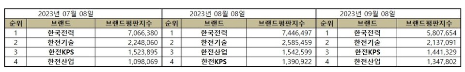 2023년 9월 전기 유틸리티 상장기업 브랜드평판 순위는 한국전력, 한전기술, 한전KPS, 한전산업 순으로 분석됐다.