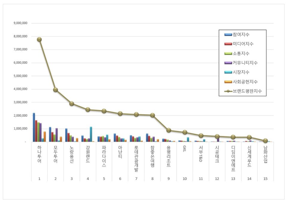 2위, 모두투어 브랜드는 참여지수 1,121,209 미디어지수 737,263 소통지수 561,519 커뮤니티지수 1,027,412 시장지수 106,929 사회공헌지수 400,693이 되면서 브랜드평판지수 3,955,025로 분석됐다. 지난 8월 브랜드평판지수 4,073,672와 비교해보면 2.91% 하락했다.