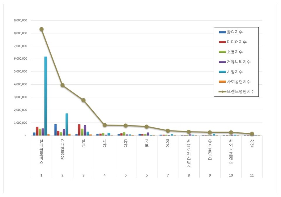 3위, 한진 브랜드는 참여지수 119,775 미디어지수 889,086 소통지수 548,915 커뮤니티지수 820,795 시장지수 297,451 사회공헌지수 86,288이 되면서 브랜드평판지수 2,762,310으로 분석됐다. 지난 8월 브랜드평판지수 2,846,547과 비교해보면 2.96% 하락했다.