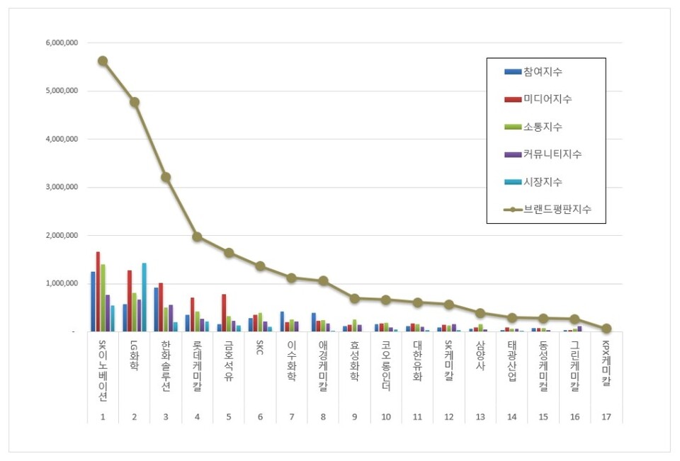 2위, LG화학 브랜드는 참여지수 577,317 미디어지수 1,286,634 소통지수 817,859 커뮤니티지수 672,835 시장지수 1,427,215가 되면서 브랜드평판지수 4,781,861로 분석됐다. 지난 8월 브랜드평판지수 4,809,519와 비교해보면 0.58% 하락했다.