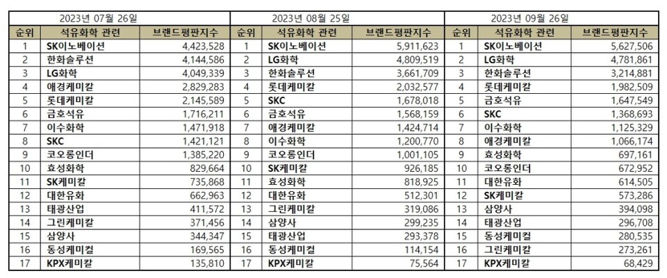 석유화학 관련 상장기업 브랜드평판 2023년 9월 빅데이터 분석 순위는 SK이노베이션, LG화학, 한화솔루션, 롯데케미칼, 금호석유, SKC, 이수화학, 애경케미칼, 효성화학, 코오롱인더, 대한유화, SK케미칼, 삼양사, 태광산업, 동성케미컬, 그린케미칼, KPX케미칼 순이었다.