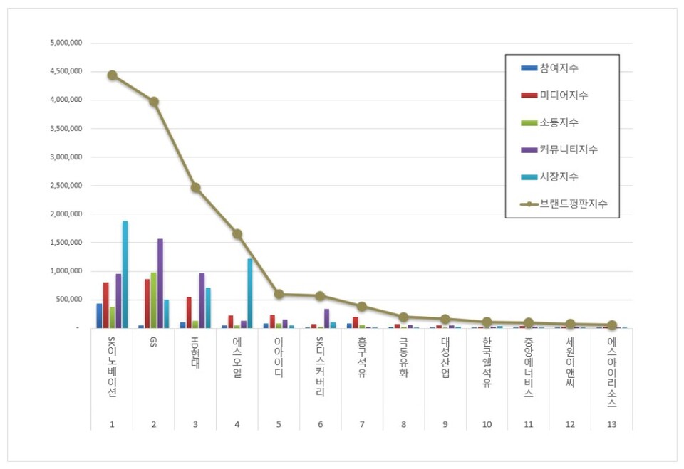 1위, SK이노베이션 브랜드는 참여지수 436,342 미디어지수 803,549 소통지수 369,171 커뮤니티지수 955,159 시장지수 1,878,915가 되면서 브랜드평판지수 4,443,136으로 분석됐다. 지난 9월 브랜드평판지수 4,873,530과 비교해보면 8.83% 하락했다.