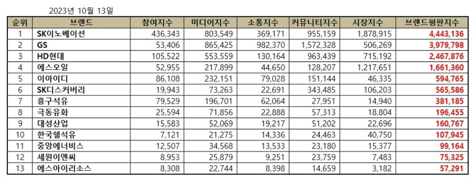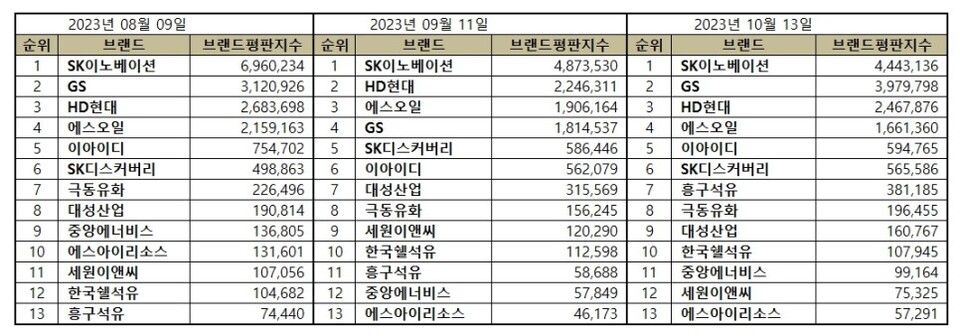 2023년 10월 석유가스 상장기업 브랜드평판 순위는 SK이노베이션, HD현대, 에스오일, GS, SK디스커버리, 이아이디, 대성산업, 극동유화, 세원이앤씨, 한국쉘석유, 흥구석유, 중앙에너비스, 에스아이리소스 순으로 분석됐다.