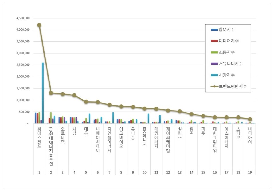 1위, 씨에스윈드 브랜드는 참여지수 478,588 미디어지수 455,661 소통지수 496,257 커뮤니티지수 162,373 시장지수 2,612,156이 되면서 브랜드평판지수 4,205,036으로 분석됐다. 지난 9월 브랜드평판지수 5,225,555와 비교해보면 19.53% 하락했다.
