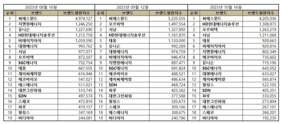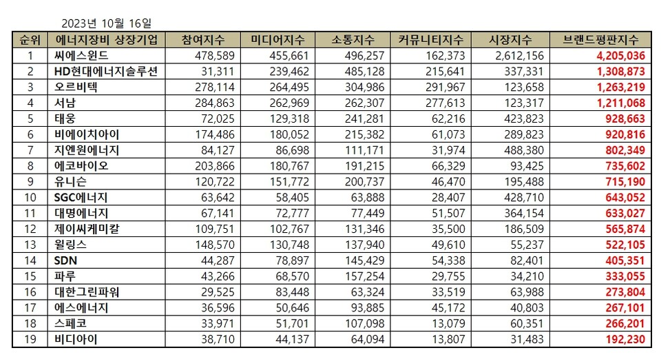 2023년 10월 에너지장비 상장기업 브랜드평판 빅데이터 분석 순위는 씨에스윈드, HD현대에너지솔루션, 오르비텍, 서남, 태웅, 비에이치아이, 지엔원에너지, 에코바이오, 유니슨, SGC에너지, 대명에너지, 제이씨케미칼, 윌링스, SDN, 파루, 대한그린파워, 에스에너지, 스페코, 비디아이 순이었다.