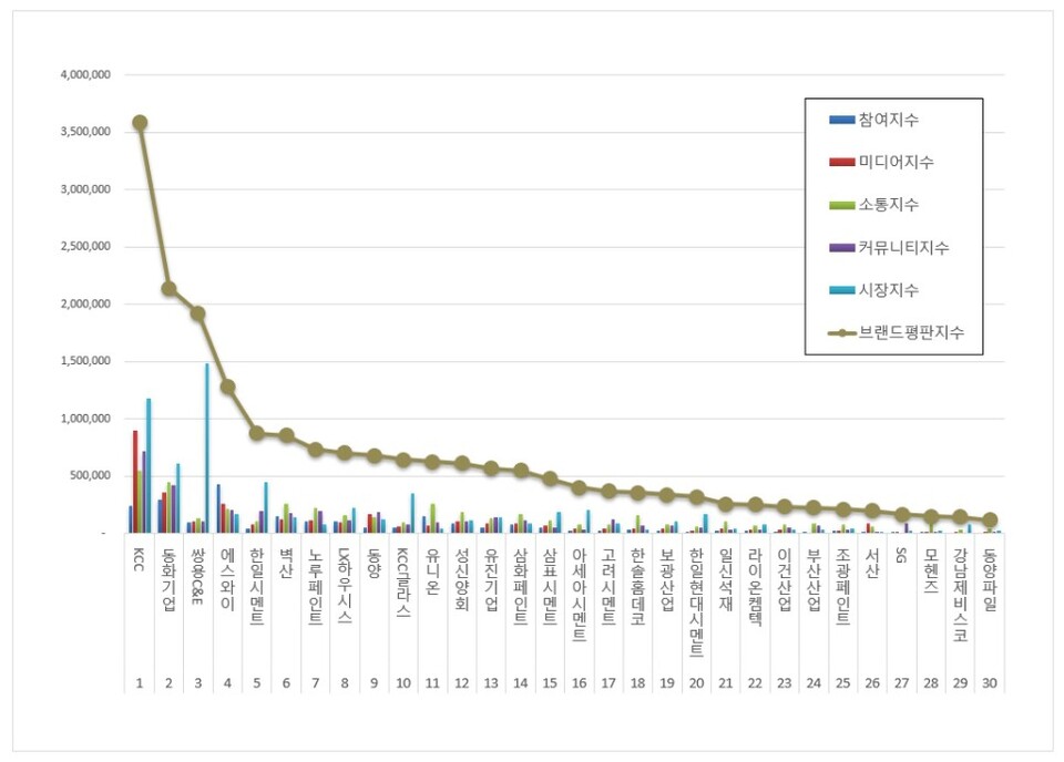 건축자재 상장기업 브랜드평판 1위를 기록한 KCC 브랜드는 참여지수 240,960 미디어지수 898,979 소통지수 548,232 커뮤니티지수 720,112 시장지수 1,175,335가 되면서 브랜드평판지수 3,583,618로 분석됐다. 지난 9월 브랜드평판지수 3,013,906과 비교해보면 18.90% 상승했다.