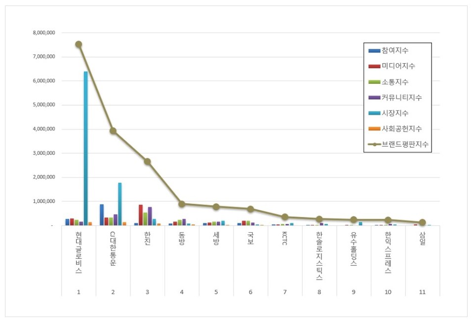 2위, CJ대한통운 브랜드는 참여지수 875,529 미디어지수 337,728 소통지수 331,203 커뮤니티지수 460,217 시장지수 1,786,114 사회공헌지수 136,503이 되면서 브랜드평판지수 3,927,293으로 분석됐다. 지난 9월 브랜드평판지수 3,939,894와 비교해보면 0.32% 하락했다.
