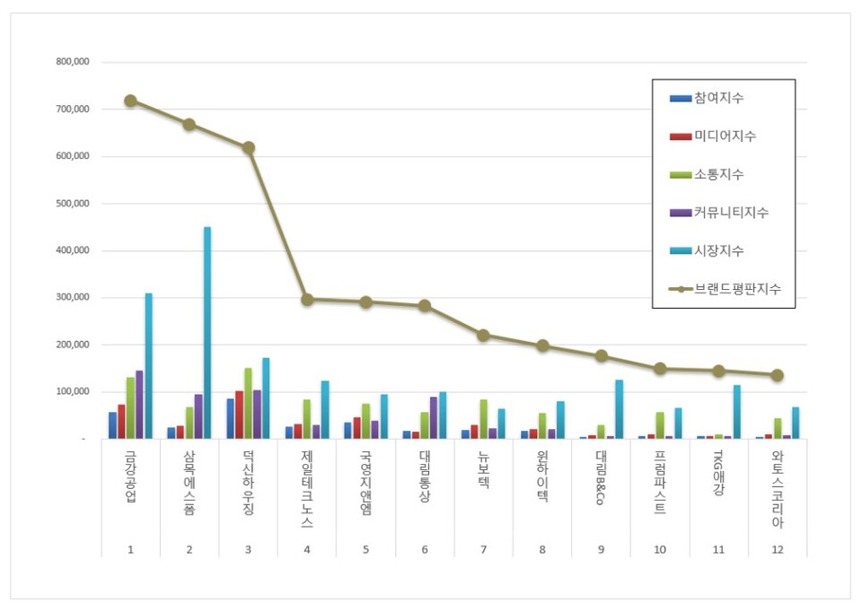 건축제품 상장기업 브랜드평판 1위를 기록한 금강공업 브랜드는 참여지수 58,058 미디어지수 73,353 소통지수 131,402 커뮤니티지수 145,191 시장지수 310,624가 되면서 브랜드평판지수 718,628로 분석됐다. 지난 9월 브랜드평판지수 862,949와 비교해보면 16.72% 하락했다.