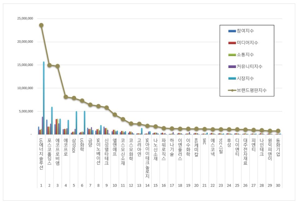 1위, LG에너지솔루션 브랜드는 참여지수 1,725,761 미디어지수 1,008,115 소통지수 1,234,400 커뮤니티지수 3,862,832 시장지수 15,769,812가 되면서 브랜드평판지수 23,600,920으로 분석됐다. 지난 9월 브랜드평판지수 20,300,828과 비교해보면 16.26% 상승했다.