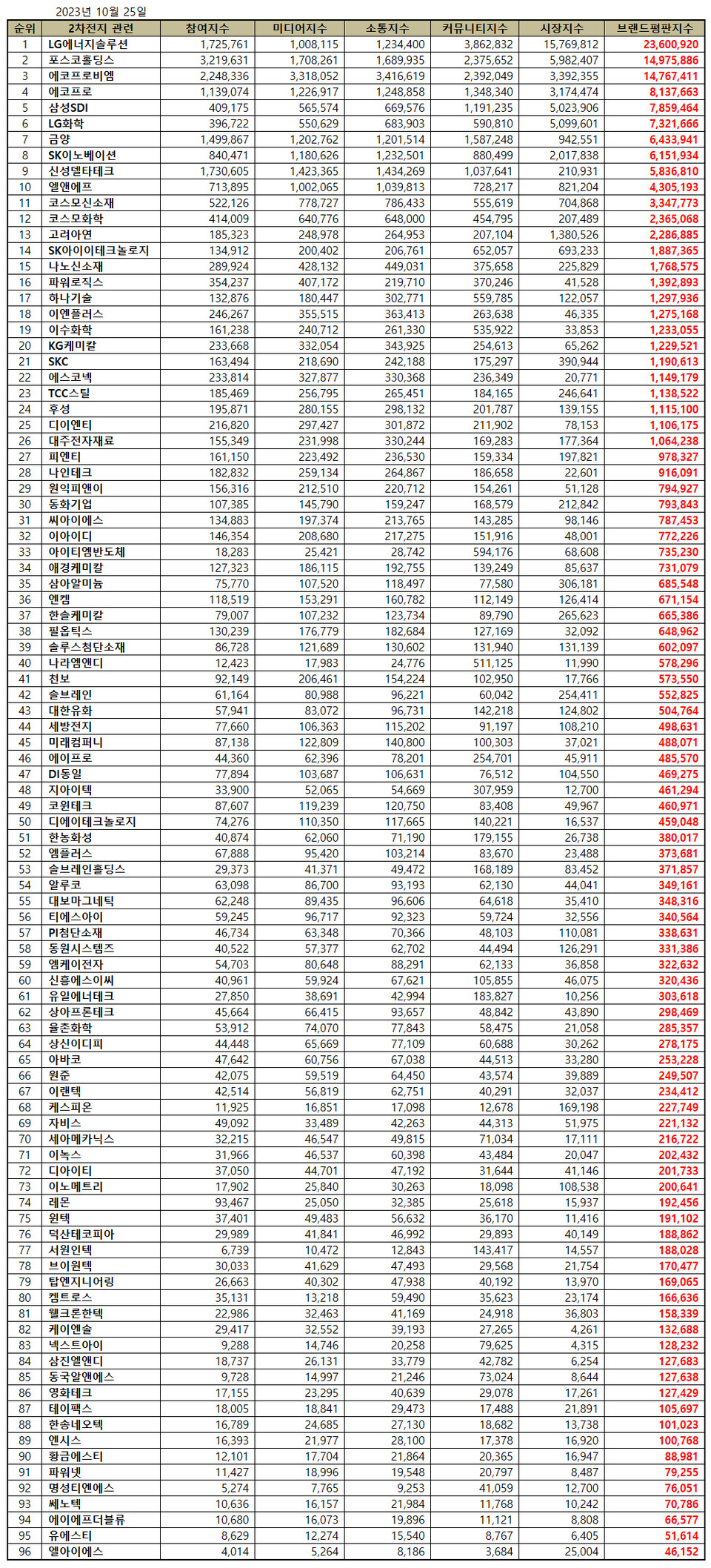 2차전지 관련 상장기업 2023년 10월 브랜드평판 분석한 브랜드는 LG에너지솔루션, 포스코홀딩스, 에코프로비엠, 에코프로, 삼성SDI, LG화학, 금양, SK이노베이션, 신성델타테크, 엘앤에프, 코스모신소재, 코스모화학, 고려아연, SK아이이테크놀로지, 나노신소재, 파워로직스, 하나기술, 이엔플러스, 이수화학, KG케미칼, SKC, 에스코넥, TCC스틸, 후성, 디이엔티, 대주전자재료, 피엔티, 나인테크, 원익피앤이, 동화기업, 씨아이에스, 이아이디, 아이티엠반도체, 애경케미칼, 삼아알미늄, 엔켐, 한솔케미칼, 필옵틱스, 솔루스첨단소재, 나라엠앤디, 천보, 솔브레인, 대한유화, 세방전지, 미래컴퍼니, 에이프로, DI동일, 지아이텍, 코윈테크, 디에이테크놀로지, 한농화성, 엠플러스, 솔브레인홀딩스, 알루코, 대보마그네틱, 티에스아이, PI첨단소재, 동원시스템즈, 엠케이전자, 신흥에스이씨, 유일에너테크, 상아프론테크, 율촌화학, 상신이디피, 아바코, 원준, 이랜텍, 케스피온, 자비스, 세아메카닉스, 이녹스, 디아이티, 이노메트리, 레몬, 윈텍, 덕산테코피아, 서원인텍, 브이원텍, 탑엔지니어링, 켐트로스, 웰크론한텍, 케이엔솔, 넥스트아이, 삼진엘앤디, 동국알앤에스, 영화테크, 테이팩스, 한송네오텍, 엔시스, 황금에스티, 파워넷, 명성티엔에스, 쎄노텍, 에이에프더블류, 유에스티, 엘아이에스이다.