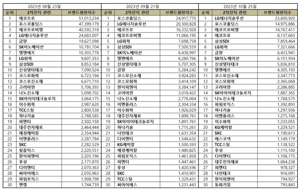 2차전지 관련 상장기업 브랜드평판 2023년 10월 빅데이터 분석 30위 순위는 LG에너지솔루션, 포스코홀딩스, 에코프로비엠, 에코프로, 삼성SDI, LG화학, 금양, SK이노베이션, 신성델타테크, 엘앤에프, 코스모신소재, 코스모화학, 고려아연, SK아이이테크놀로지, 나노신소재, 파워로직스, 하나기술, 이엔플러스, 이수화학, KG케미칼, SKC, 에스코넥, TCC스틸, 후성, 디이엔티, 대주전자재료, 피엔티, 나인테크, 원익피앤이, 동화기업 순이었다.