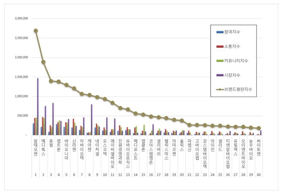 생물공학 상장기업 브랜드평판 1위를 기록한 알테오젠 브랜드는 참여지수 310,524 소통지수 447,343 커뮤니티지수 461,911 시장지수 1,472,145가 되면서 브랜드평판지수 2,691,923으로 분석됐다. 지난 9월 브랜드평판지수 2,766,020과 비교해보면 2.68% 하락했다.