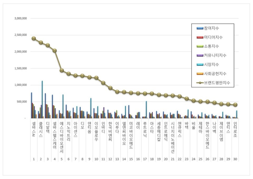 5위, 에스디바이오센서 브랜드는 참여지수 241,041 미디어지수 155,777 소통지수 133,260 커뮤니티지수 138,532 시장지수 713,099 사회공헌지수 57,888이 되면서 브랜드평판지수 1,439,597로 분석됐다. 지난 9월 브랜드평판지수 2,090,543과 비교해보면 31.14% 하락했다.