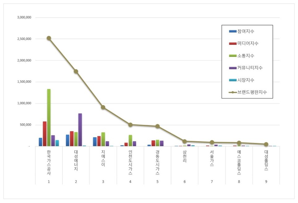 1위, 한국가스공사 브랜드는 참여지수 196,421 미디어지수 577,809 소통지수 1,338,982 커뮤니티지수 260,330 시장지수 147,770이 되면서 브랜드평판지수 2,521,313으로 분석됐다. 지난 10월 브랜드평판지수 1,639,210과 비교해보면 53.81% 상승했다.