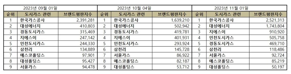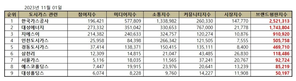 도시가스 상장기업 브랜드평판 2023년 11월 빅데이터 분석 순위는 한국가스공사, 대성에너지, 지에스이, 인천도시가스, 경동도시가스, 삼천리, 서울가스, 예스코홀딩스, 대성홀딩스 순이었다.