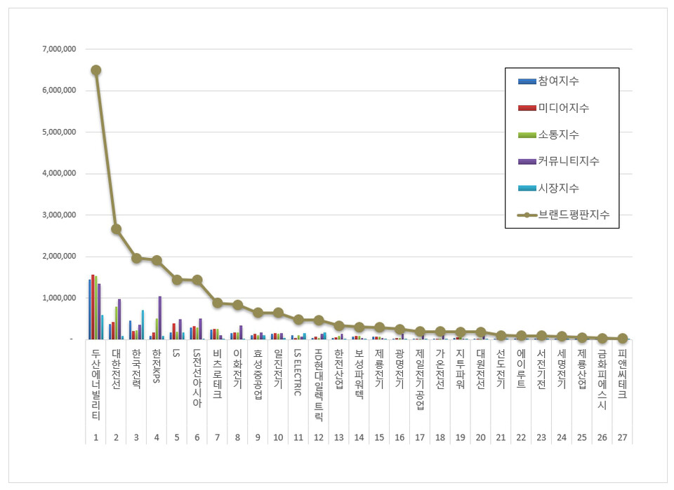 전력설비 상장기업 브랜드평판 분석은 참여지수, 미디어지수, 소통지수, 커뮤니티지수, 시장지수로 구분하여 브랜드평판지수를 산출했다.