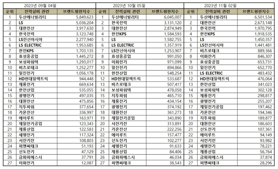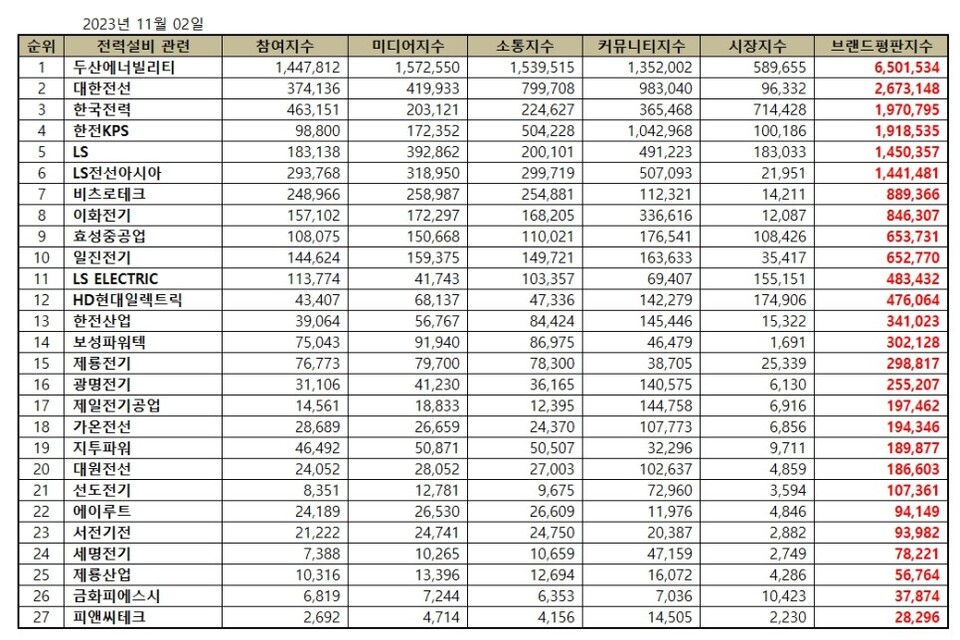 전력설비 상장기업 브랜드평판 2023년 11월 빅데이터 분석 순위는 두산에너빌리티, 대한전선, 한국전력, 한전KPS, LS, LS전선아시아, 비츠로테크, 이화전기, 효성중공업, 일진전기, LS ELECTRIC, HD현대일렉트릭, 한전산업, 보성파워텍, 제룡전기 , 광명전기, 제일전기공업, 가온전선, 지투파워, 대원전선, 선도전기, 에이루트, 서전기전, 세명전기, 제룡산업, 금화피에스시, 피앤씨테크 순이었다.