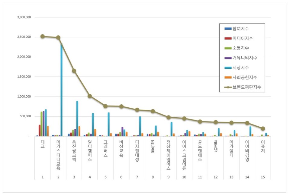 2위, 메가스터디교육 브랜드는 참여지수 35,386 미디어지수 25,605 소통지수 40,025 커뮤니티지수 35,485 시장지수 2,342,946 사회공헌지수 10,979가 되면서 브랜드평판지수 2,490,426으로 분석됐다. 지난 10월 브랜드평판지수 2,225,198과 비교해보면 11.92% 상승했다.