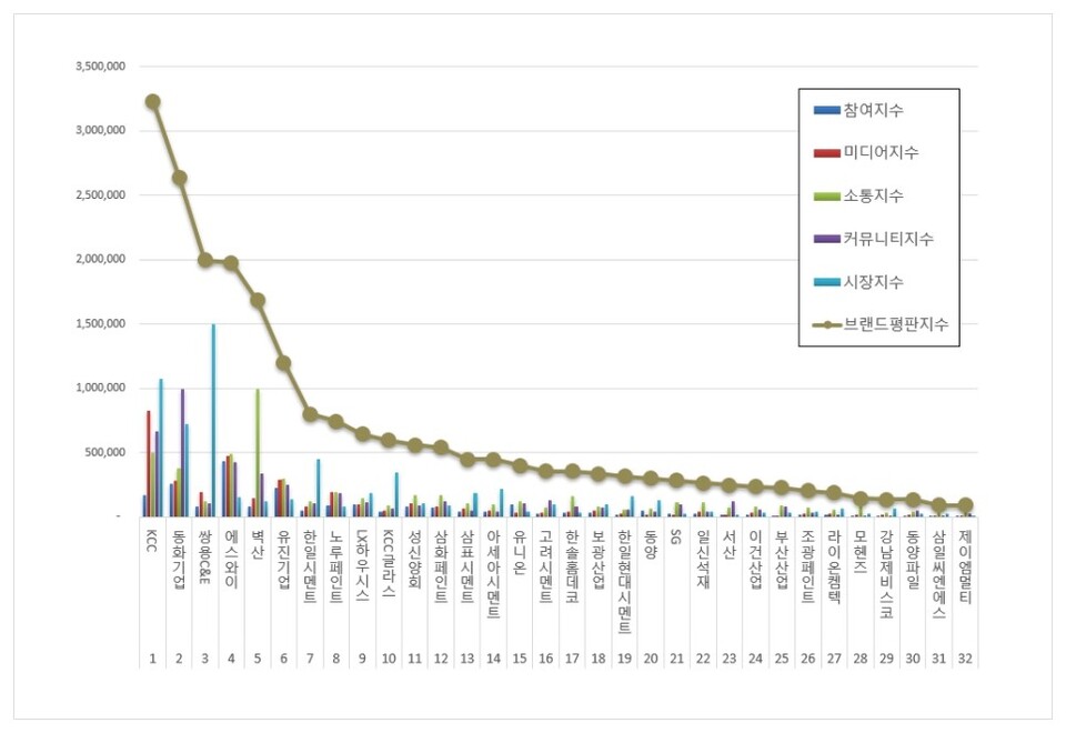 건축자재 상장기업 브랜드평판 1위를 기록한 KCC 브랜드는 참여지수 169,280 미디어지수 824,807 소통지수 498,366 커뮤니티지수 662,003 시장지수 1,070,437이 되면서 브랜드평판지수 3,224,893으로 분석됐다. 지난 10월 브랜드평판지수 3,583,618과 비교해보면 10.01% 하락했다.