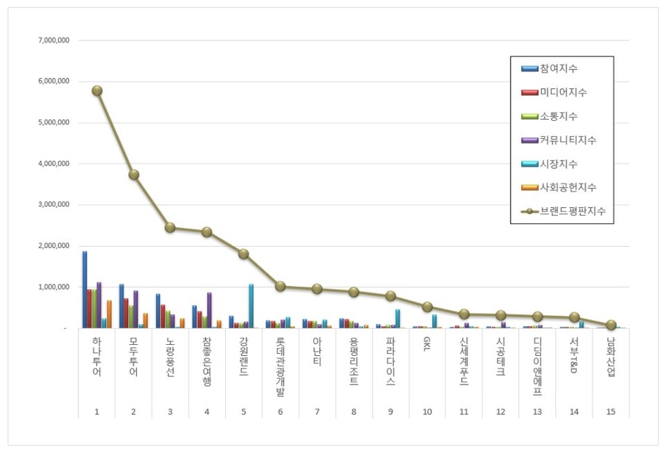 레저 상장기업 브랜드평판 1위를 기록한 하나투어 브랜드는 참여지수 1,864,410 미디어지수 938,346 소통지수 946,918 커뮤니티지수 1,111,813 시장지수 240,849 사회공헌지수 679,088이 되면서 브랜드평판지수 5,781,423으로 분석됐다. 지난 10월 브랜드평판지수 5,853,115와 비교해보면 1.22% 하락했다.