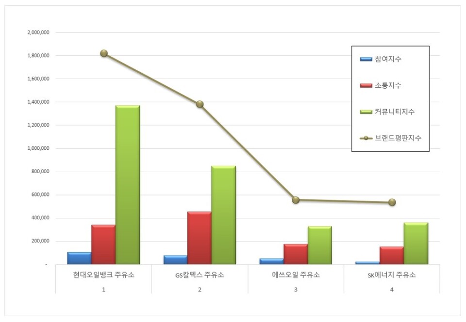 1위, 현대오일뱅크 주유소 브랜드는 참여지수 107,327 소통지수 341,863 커뮤니티지수 1,370,879가 되면서 브랜드평판지수 1,820,069로 분석됐다. 지난 10월 브랜드평판지수 1,571,982와 비교해보면 15.78% 상승했다.