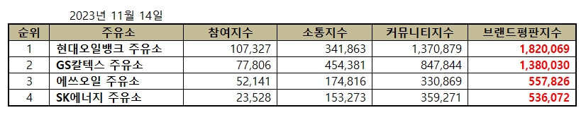 이넷뉴스와 한국기업평판연구소는 소비자들에게 사랑받는 주유소 브랜드에 대해 브랜드 빅데이터를 통한 평판조사를 했다. 4개 주유소 브랜드평판 분석은 2023년 10월 14일부터 2023년 11월 14일까지의 주유소 브랜드 빅데이터 4,293,998개를 분석하여 소비자들의 브랜드 습관과 브랜드와 관계 분석을 통해 브랜드평판을 분석했다. 지난 10월 브랜드 빅데이터 4,083,990개와 비교하면 5.14% 증가했다.