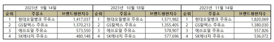 2023년 11월 주유소 브랜드평판 순위는 현대오일뱅크 주유소, GS칼텍스 주유소, 에쓰오일 주유소, SK에너지 주유소 순으로 분석됐다.
