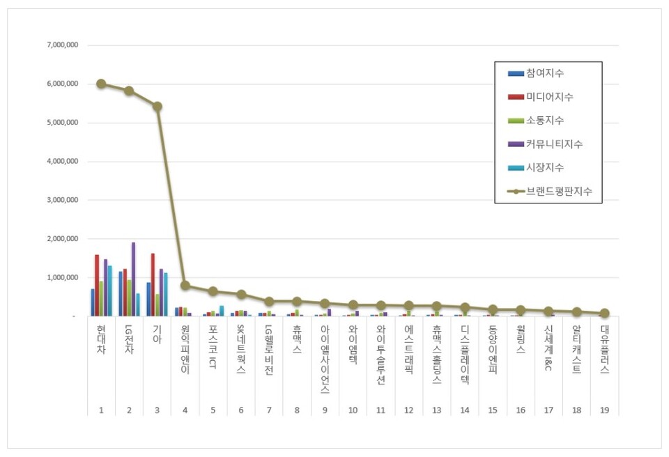 2위, LG전자 브랜드는 참여지수 1,158,957 미디어지수 1,222,952 소통지수 946,523 커뮤니티지수 1,910,410 시장지수 596,502가 되면서 브랜드평판지수 5,835,344로 분석됐다. 지난 10월 브랜드평판지수 6,992,819와 비교해보면 16.55% 하락했다.