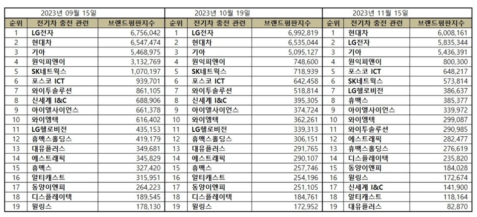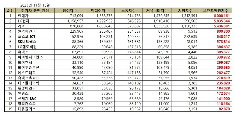 전기차 충전 관련 상장기업 브랜드평판 2023년 11월 빅데이터 분석 순위는 현대차, LG전자, 기아, 원익피앤이, 포스코 ICT, SK네트웍스, LG헬로비전, 휴맥스, 아이엘사이언스, 와이엠텍, 와이투솔루션, 에스트래픽, 휴맥스홀딩스, 디스플레이텍, 동양이엔피, 윌링스, 신세계 I&C, 알티캐스트, 대유플러스 순이었다.