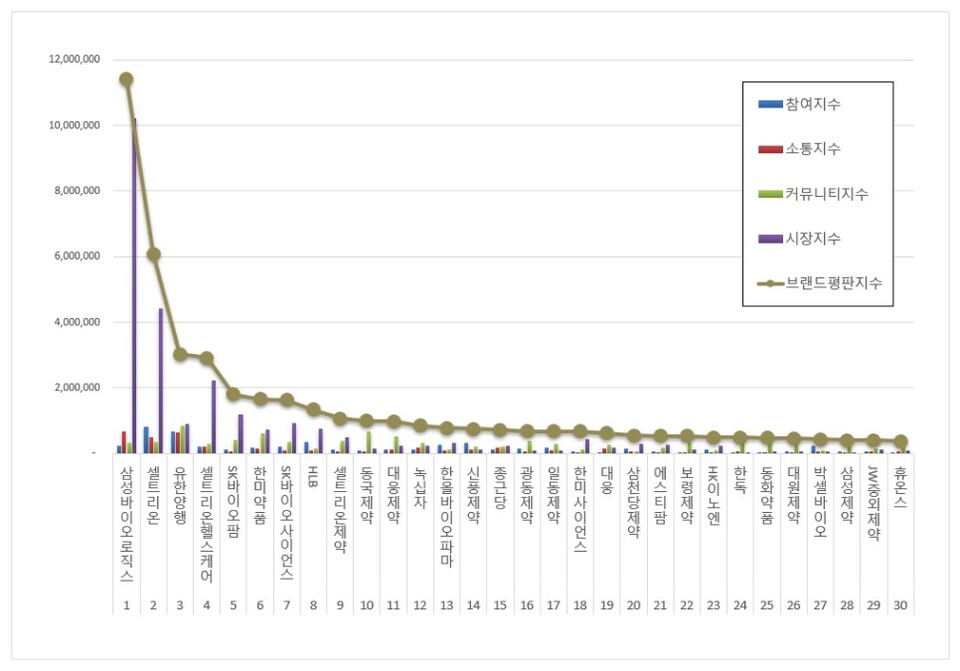 제약 상장기업 브랜드평판 1위를 기록한 삼성바이오로직스 브랜드는 참여지수 221,343 소통지수 656,852 커뮤니티지수 311,482 시장지수 10,211,369가 되면서 브랜드평판지수 11,401,046으로 분석됐다. 지난 10월 브랜드평판지수 11,385,557과 비교해보면 0.14% 상승했다.