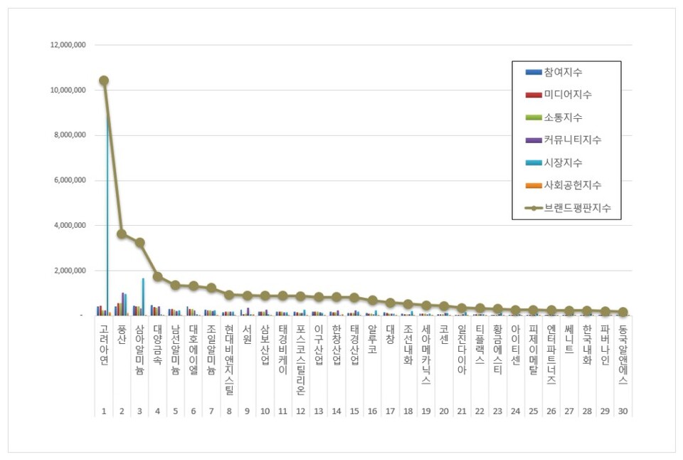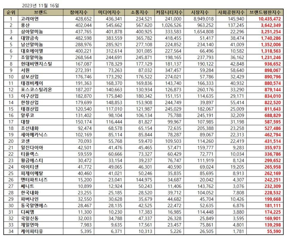 1위, 고려아연 브랜드는 참여지수 428,652 미디어지수 436,341 소통지수 234,521 커뮤니티지수 241,000 시장지수 8,949,018 사회공헌지수 145,940이 되면서 브랜드평판지수 10,435,472로 분석됐다. 지난 10월 브랜드평판지수 11,062,234와 비교해보면 5.67% 하락했다.