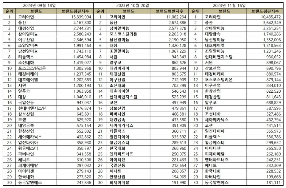 비철금속 상장기업 브랜드평판 2023년 11월 빅데이터 분석 30위 순위는 고려아연, 풍산, 삼아알미늄, 대양금속, 남선알미늄, 대호에이엘, 조일알미늄, 현대비앤지스틸, 서원, 삼보산업, 태경비케이, 포스코스틸리온, 이구산업, 한창산업, 태경산업, 알루코, 대창, 조선내화, 세아메카닉스, 코센, 일진다이아, 티플랙스, 황금에스티, 아이티센, 피제이메탈, 엔터파트너즈, 쎄니트, 한국내화, 파버나인, 동국알앤에스 순이었다.