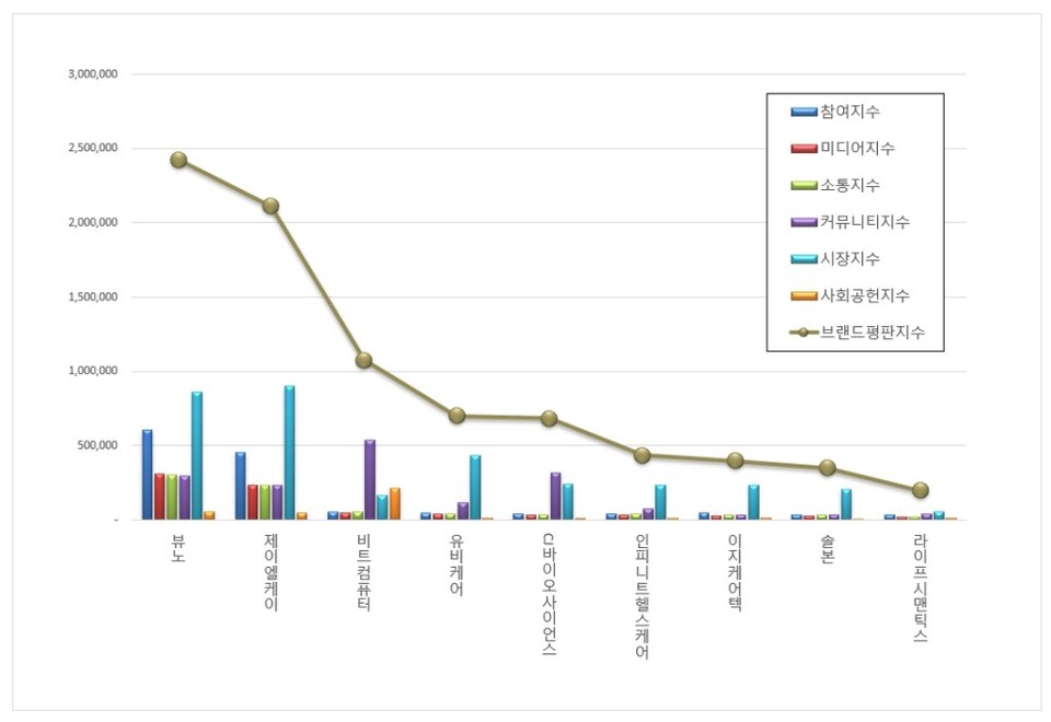 건강관리기술 상장기업 브랜드평판 2023년 11월 빅데이터 분석 순위는 뷰노, 제이엘케이, 비트컴퓨터, 유비케어, CJ바이오사이언스, 인피니트헬스케어, 이지케어텍, 솔본, 라이프시맨틱스 순이었다.