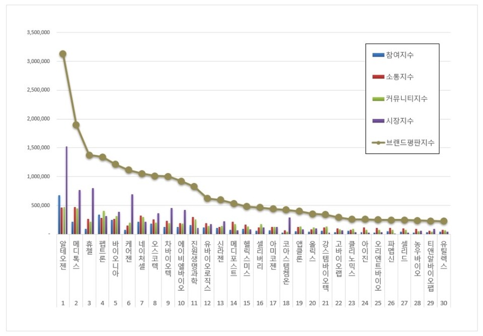 생물공학 상장기업 브랜드평판 1위를 기록한 알테오젠 브랜드는 참여지수 679,621 소통지수 461,408 커뮤니티지수 474,495 시장지수 1,521,034가 되면서 브랜드평판지수 3,136,558로 분석됐다. 지난 10월 브랜드평판지수 2,691,923과 비교해보면 16.52% 상승했다.