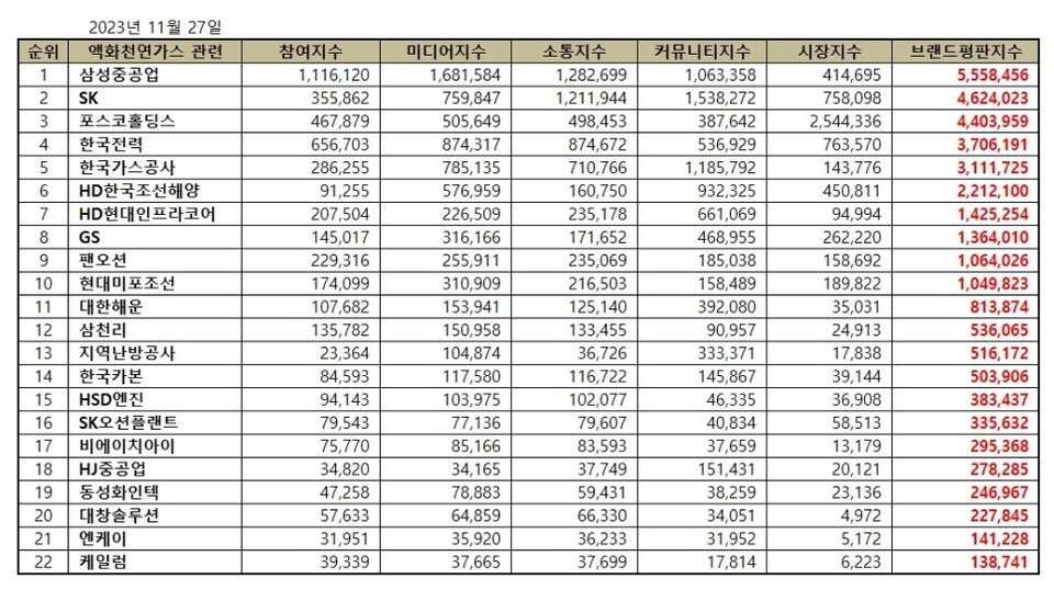 액화천연가스 LNG 관련 상장기업 브랜드평판 2023년 11월 빅데이터 분석 순위는 삼성중공업, SK, 포스코홀딩스, 한국전력, 한국가스공사, HD한국조선해양, HD현대인프라코어, GS, 팬오션, 현대미포조선, 대한해운, 삼천리, 지역난방공사, 한국카본, HSD엔진, SK오션플랜트, 비에이치아이, HJ중공업, 동성화인텍, 대창솔루션, 엔케이, 케일럼 순이었다.