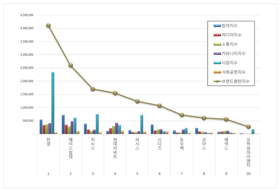 가구 상장기업 브랜드평판 1위를 기록한 한샘 브랜드는 참여지수 552,395 미디어지수 347,112 소통지수 378,640 커뮤니티지수 419,113 시장지수 2,345,570 사회공헌지수 64,586이 되면서 브랜드평판지수 4,107,415로 분석됐다. 지난 10월 브랜드평판지수 4,371,954와 비교해보면 6.05% 하락했다.