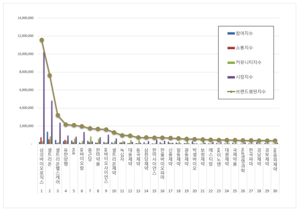 제약 상장기업 브랜드평판 1위를 기록한 삼성바이오로직스 브랜드는 참여지수 233,359 소통지수 768,679 커뮤니티지수 327,990 시장지수 10,240,165가 되면서 브랜드평판지수 11,570,193으로 분석됐다. 지난 11월 브랜드평판지수 11,401,046과 비교해보면 1.48% 상승했다.