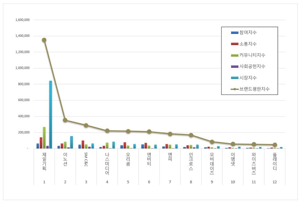3위, SM C&C 브랜드는 참여지수 49,517 소통지수 100,190 커뮤니티지수 53,381 사회공헌지수 23,790 시장지수 62,833이 되면서 브랜드평판지수 289,711로 분석됐다. 지난 11월 브랜드평판지수 301,379와 비교해보면 3.87% 하락했다.