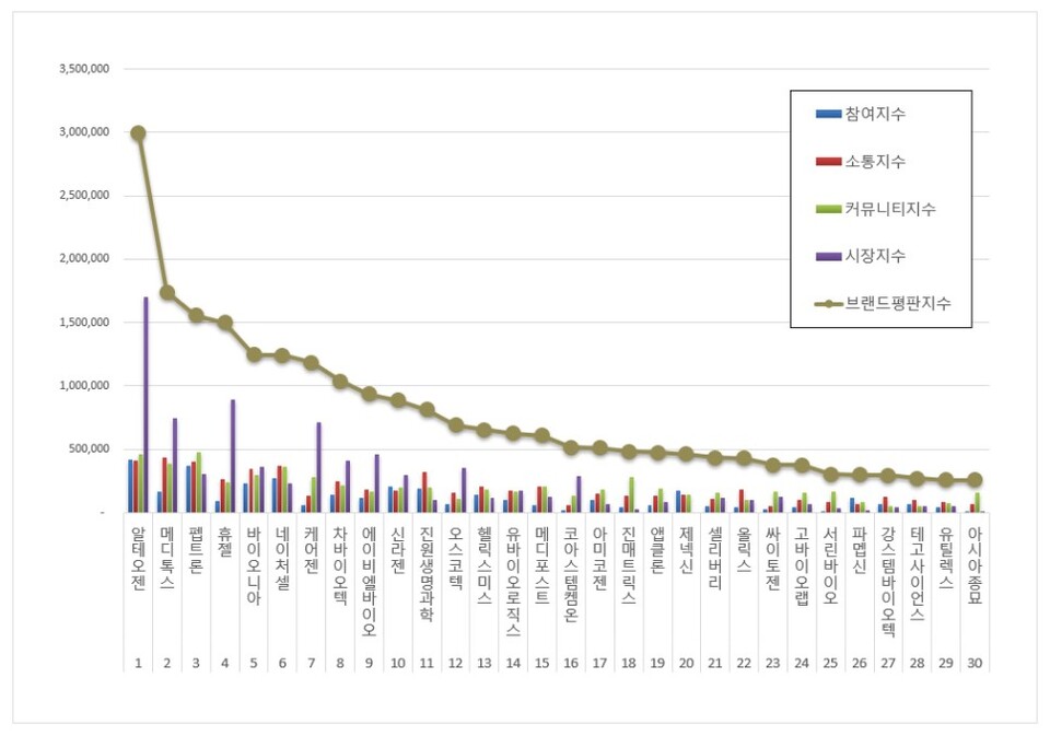생물공학 상장기업 브랜드평판 분석은 참여지수, 소통지수, 커뮤니티지수, 시장지수로 구분하여 브랜드평판지수를 산출했다.