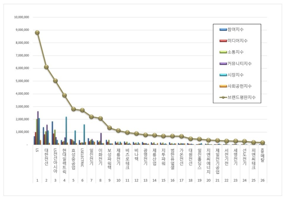 2위, 대한전선 브랜드는 참여지수 1,379,940 미디어지수 819,824 소통지수 1,053,886 커뮤니티지수 1,575,752 시장지수 1,114,374 사회공헌지수 161,552가 되면서 브랜드평판지수 6,105,328로 분석됐다. 지난 11월 브랜드평판지수 6,139,036과 비교해보면 0.55% 하락했다.