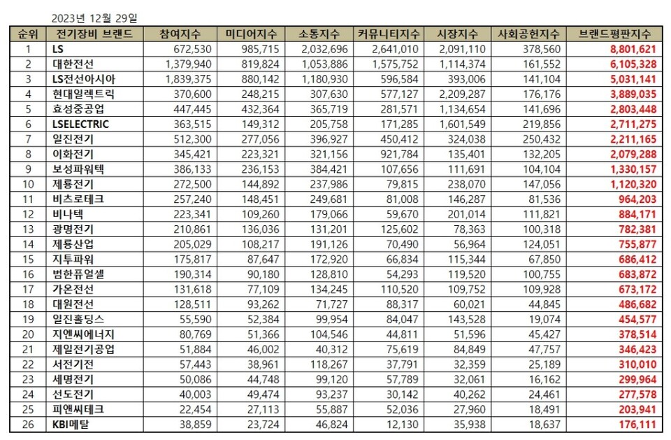 전기장비 상장기업 브랜드평판 2023년 12월 빅데이터 분석 순위는 LS, 대한전선, LS전선아시아, 현대일렉트릭, 효성중공업, LSELECTRIC, 일진전기, 이화전기, 보성파워텍, 제룡전기, 비츠로테크, 비나텍, 광명전기, 제룡산업, 지투파워, 범한퓨얼셀, 가온전선, 대원전선, 일진홀딩스, 지엔씨에너지, 제일전기공업, 서전기전, 세명전기, 선도전기, 피앤씨테크, KBI메탈 순이었다.