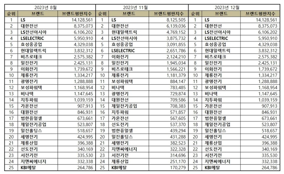 이넷뉴스 에너지 톱 브랜드위원회는 29일 전기장비 관련 상장기업 ‘2023년 12월 빅데이터 분석결과’를 발표했다. 발표에 따르면, 1위 LS 2위 대한전선 3위 LS전선아시아 순으로 나타났다.