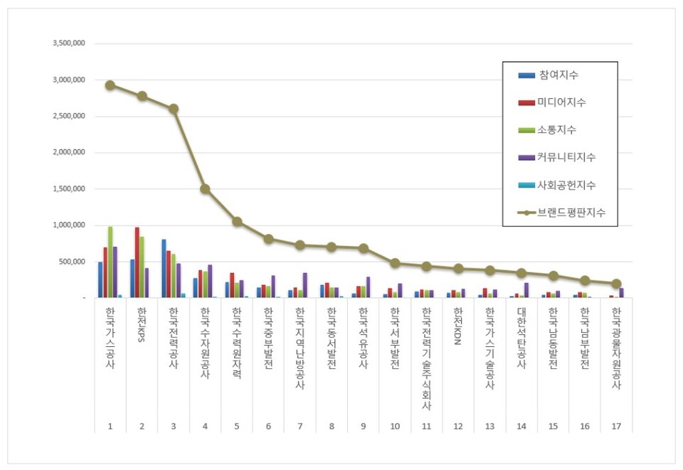 5위, 한국수력원자력 브랜드는 참여지수 222,335 미디어지수 351,940 소통지수 208,221 커뮤니티지수 246,441 사회공헌지수 23,549가 되면서 브랜드평판지수 1,052,486으로 분석됐다. 지난 11월 브랜드평판지수 1,282,207과 비교해보면 17.92% 하락했다.