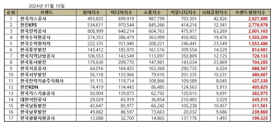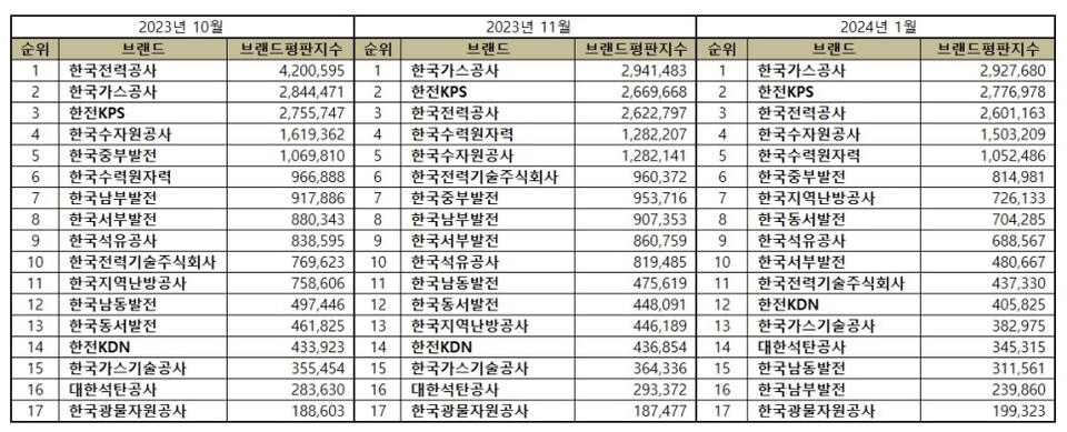 2024년 1월 에너지 공기업 브랜드평판 순위는 한국가스공사, 한전KPS, 한국전력공사, 한국수자원공사, 한국수력원자력, 한국중부발전, 한국지역난방공사, 한국동서발전, 한국석유공사, 한국서부발전, 한국전력기술주식회사, 한전KDN, 한국가스기술공사, 대한석탄공사, 한국남동발전, 한국남부발전, 한국광물자원공사 순으로 분석됐다.