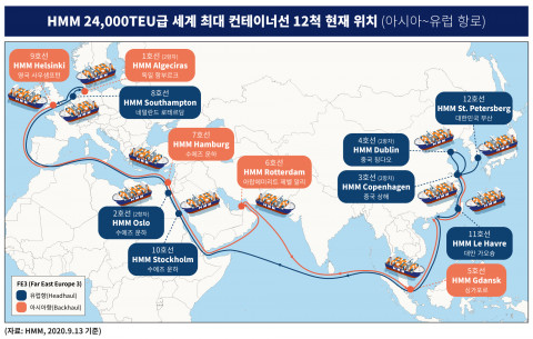 [이넷뉴스] 대한민국 대표 원양국적선사 HMM(대표이사 배재훈)은 2만4000TEU급 세계 최대 컨테이너선 12척을 모두 아시아-유럽 항로에 투입했다고 13일 밝혔다.