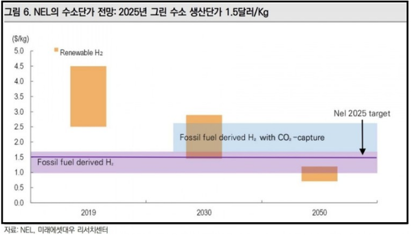 NH투자증권 이민재 연구원은 "청록색 수소는 천연가스에서 생산되기 때문에 녹색 수소산업보다 운영비 효율이 더 높다. 경제성은 천연가스 가격 추이에 달려 있다"고 밝혔다.